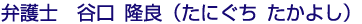 | 職歴 | 昭和44年 司法試験合格 昭和47年 弁護士登録 昭和47年 弁護士開業(東京から横浜市関内事務所移転) 昭和56年 桜美林短期大学講師(平成1年3月迄) 平成6年 相模原市に谷口法律事務所を移転、開業 平成6年 横浜弁護士会網紀委員(歴任) 平成6年 横浜家庭裁判所調停委員(歴任) 平成9年 神奈川県労働基準局の神奈川地方最低賃金審議会公益委員(歴任)、神奈川地方労働審査会公益委員 平成10年 相模原市人権擁護委員(歴任) 平成13年 東京都日野市市民オンブスパーソン(歴任) 平成14年 相模原市男女共同参画専門相談員 平成19年 相模原市高齢者虐待防止ネットワーク協議会委員 |